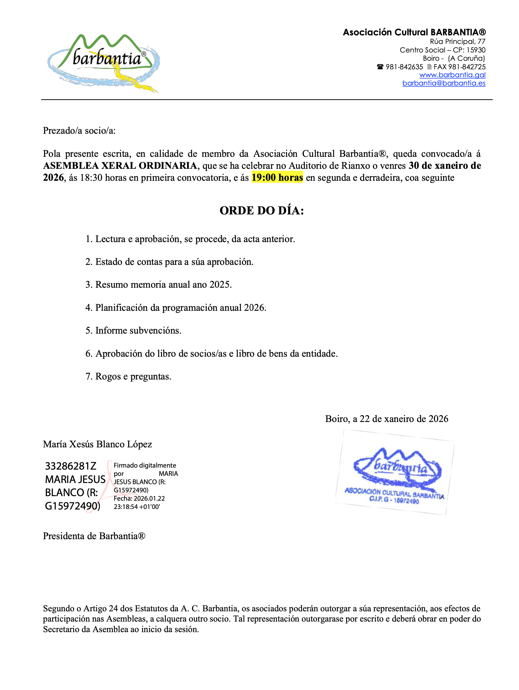 CONVOCATORIA ASEMBLEA XERAL ORDINARIA 30/01/2026